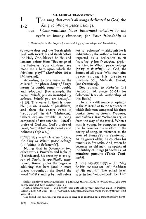 The beautiful love song between G-d and Israel that Rabbi Akiva calls "Holy of Holies." The first English translation faithful to the allegory that is the Song's authentic meaning. The ArtScroll Series presents the comments of the classic giants of ancient and contemporary times in a logical, comprehensible manner, like a master teacher on an exciting voyage of intellectual discovery.