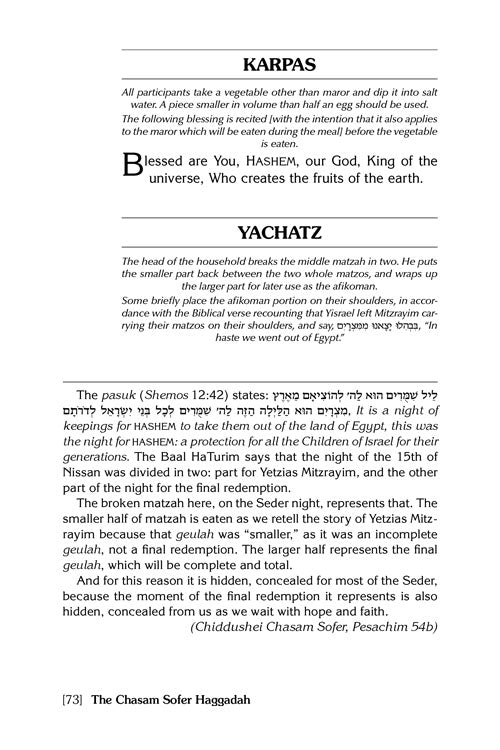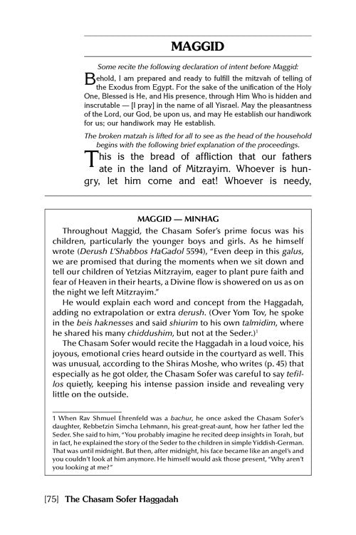 “Even deep in this galus,” the Chasam Sofer taught, “we are promised that during the moments when we sit down and tell our children of yetzias Mitzrayim … a Divine flow is showered onto us, as on the night we left Mitzrayim.” The Chasam Sofer Haggadah will help us turn that “Divine flow” into a surging tide of faith and joy.